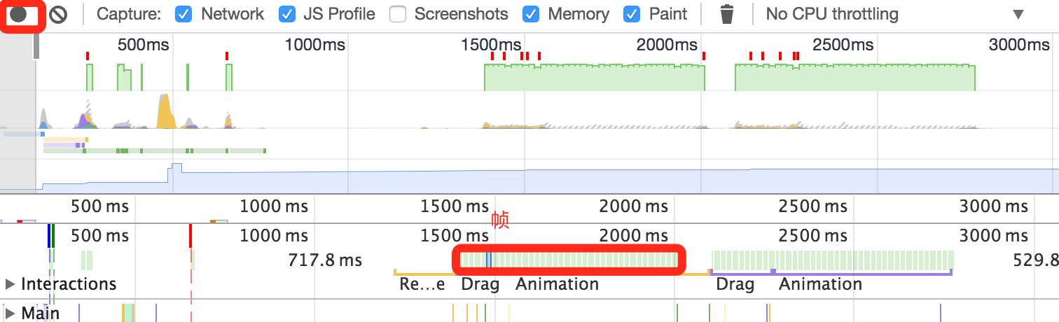 1. 点击左上角的录制之后,录制结束后会生成下面的样子,红色区域内就是帧了,移动上去可以看到每一帧的频率,如果>60fps,就是比较流畅,如果。