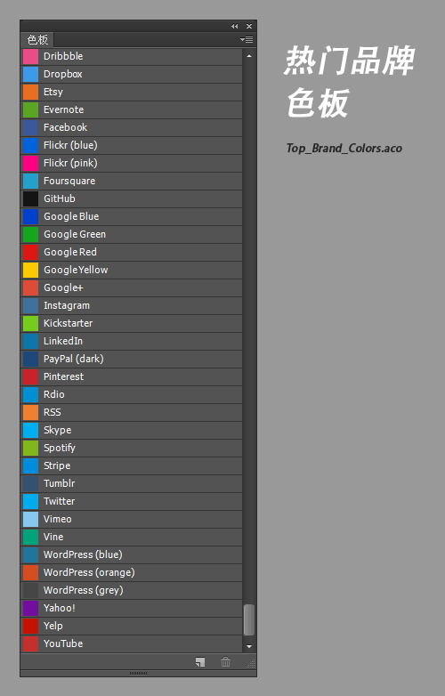 素材格式:.aco (安装方法:直接在色板工具面板导入即可)下载地址:https://pan.baidu.com/s/1dE4ze2P 密码: 3hsu