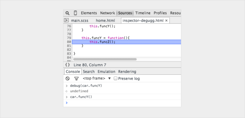 在 console 中输入 debug(car.funcY),在调试模式下当调用 car.faunY 时脚本会停下来: