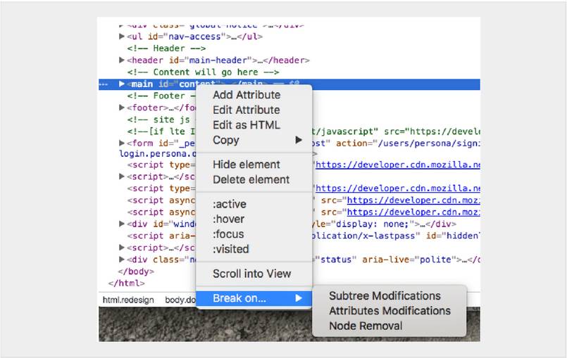 DOM 是个有趣的东西。有时它发生了变化,然而你却一脸懵逼,不知道为啥。但是,当你使用 Chrome 调试 JavaScript,DOM 发生变化时,你可以暂停,甚至可以监控属性的变化。在 Chrome Inspector 中,右键点击某个元素,然后选择 break on 设置来使用: