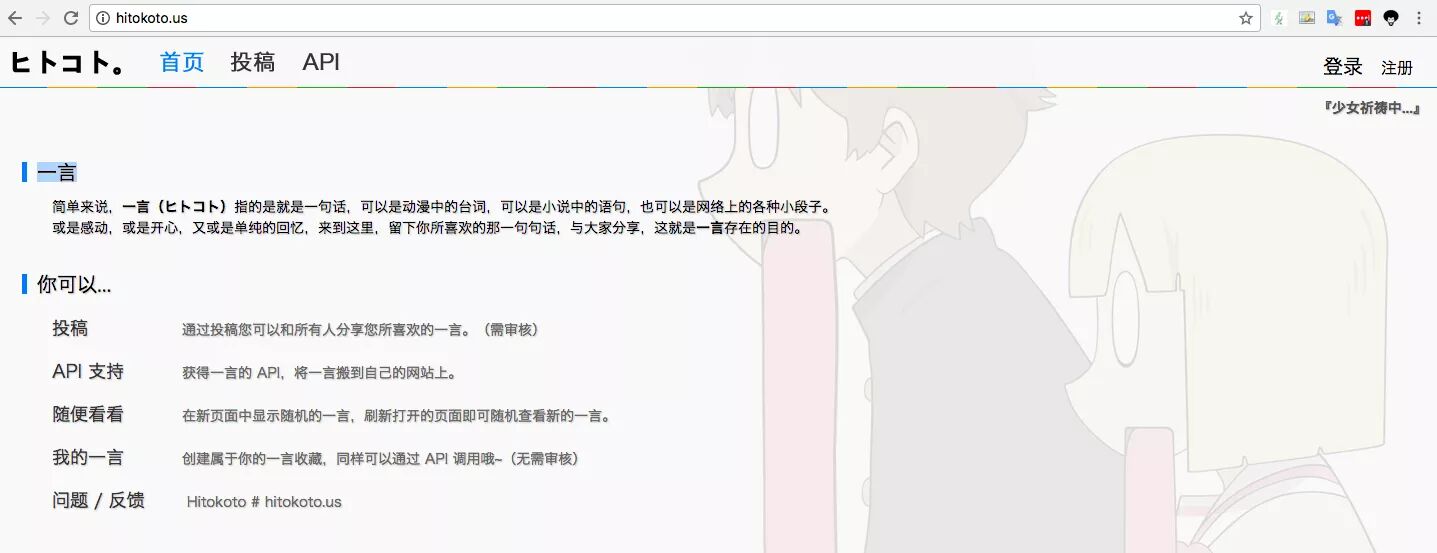 网页内介绍:简单来说,一言(ヒトコト)指的是就是一句话,可以是动漫中的台词,可以是小说中的语句,也可以是网络上的各种小段子。或是感动,或是开心,又或是单纯的回忆,来到这里,留下你所喜欢的那一句句话,与大家分享,这就是一言存在的目的。via 用户 31860174