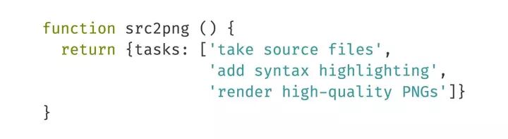 使用这个库,你可以将源码生成为语法高亮的图片进行展示。你还可以了解下它的工作流程:src2png 启动 Poi dev 服务程序,并使用 Puppeteer 运行 Headless Chrome 实例,完成渲染、裁剪后,最终保存截图。