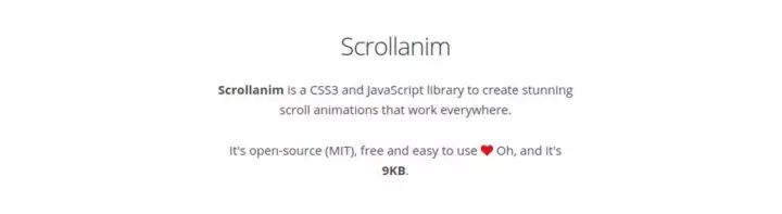Scrollanim 是一个用于创建滚动动画的轻量级 CSS3 + JS 库。它是一个开源库,且易于使用。由于使用了 Animate.css 以及拥有丰富的内置 CSS3 动画,所以你可以选择淡入、淡出等动画效果。