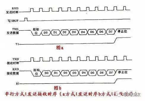 一条写SBUF指令就可启动数据发送过程。在发送移位时钟(由波特率确定)的同步下,从TxD先送出起始位,然后是8位数据位,最后是停止位。这样的一帧10位数据发送完后,中断标志TI置位。