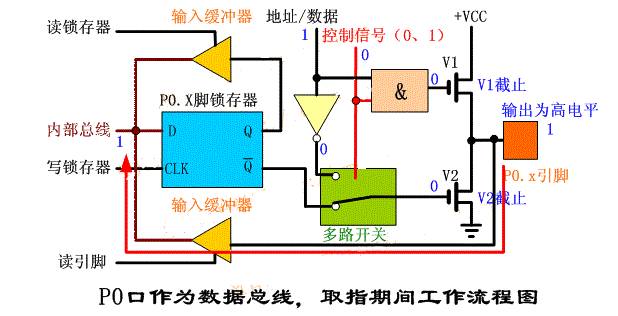 在取指令期间,“控制”信号为“0”,V1管截止,多路开关也跟着转向锁存器反相输出端Q非;CPU自动将0FFH(11111111,即向D锁存器写入一个高电平‘1’)写入P0口锁存器,使V2管截止,在读引脚信号控制下,通过读引脚三态门电路将指令码读到内部总线。请看下图