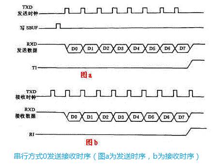 在方式0中,串行端口作为输出时,只要向串行缓冲器SBUF写入一字节数据后,串行端口就把此8位数据以等的波特率,从RXD引脚逐位输出(从低位到高位);此时,TXD输出频率为fosc/12的同步移位脉冲。数据发送前,仅管不使用中断,中断标志TI还必须清零,8位数据发送完后,TI自动置1。如要再发送,必须用软件将TI清零。