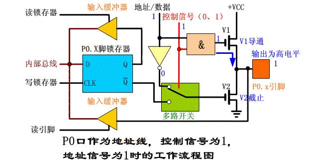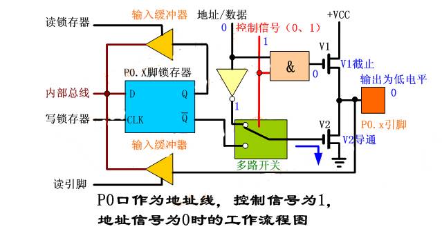 P0口作为I/O端口使用时,多路开关的控制信号为0(低电平),看上图中的线线部份,多路开关的控制信号同时与与门的一个输入端是相接的,我们知道与门的逻辑特点是“全1出1,有0出0”那么控制信号是0的话,这时与门输出的也是一个0(低电平),与让的输出是0,V1管就截止,在多路控制开关的控制信号是0(低电平)时,多路开关是与锁存器的Q非端相接的(即P0口作为I/O口线使用)。