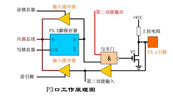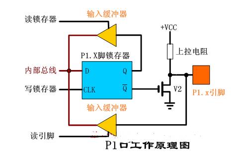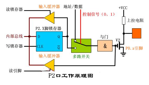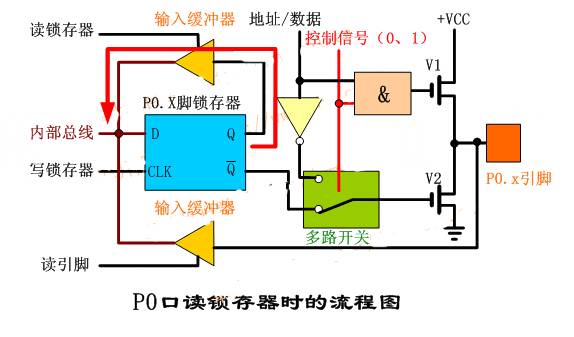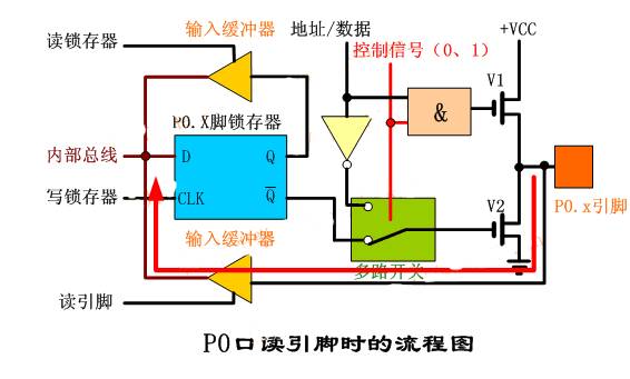 读芯片引脚上的数据,读引脚数时,读引脚缓冲器打开(即三态缓冲器的控制端要有效),通过内部数据总线输入,请看下图(红色简头)。