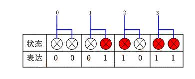 下面有一盏灯,我们知道灯要么亮,要么不亮,就有两种状态,我们可以用“0”和“1”来代替这两种状态,规定亮为“1”,不亮为“0”。南以上两盏灯,一共有几种状态呢?