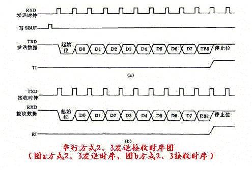 11位异步通信方式。其中,1个起始位(0),8个数据位(由低位到高位),1个附加的第9位和1个停止住(1)。方式2和方式3除波特率不同外,其它性能完全相同。方式2,3的发送、接收时序见下图。