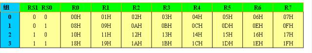在00H—1FH共32个单元中被均匀地分为四块,每块包含八个8位寄存器,均以R0—R7来命名,我们常称这些寄存器为通用寄存器。这四块中的寄存器都称为R0—R7,那么在程序中怎么区分和使用它们呢?聪明的INTEL工程师们又安排了一个寄存器——程序状态字寄存器(PSW)来管理它们,CPU只要定义这个寄存的PSW的D3和D4位(RS0和RS1),即可选中这四组通用寄存器。对应的编码关系如下表所示。惹程序中并不需要用4组,那么其余的可用做一般的数据缓冲器,CPU在复位后,选中第0组工作寄存器。