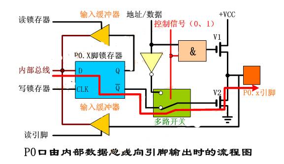 下图就是由内部数据总线向P0口输出数据的流程图(红色箭头)。