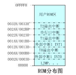 从上图中大家可以看到,0000H-0002H,只有三个存储单元,3个存储单元在我们的程序存放时是存放不了实际意义的程序的,通常我们在实际编写程序时是在这里安排一条ORG指令,通过ORG指令跳转到从0033H开始的用户ROM区域,再来安排我们的程序语言。从0033开始的用户ROM区域用户可以通过ORG指令任意安排,但在应用中应注意,不要超过了实际的存储空间,不然程序就会找不到。