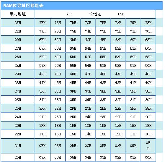片内RAM的20H—2FH单元为位寻址区,既可作为一般单元用字节寻址,也可对它们的位进行寻址。位寻址区共有16个字节,128个位,位地址为00H—7FH。位地址分配如下表所示:
