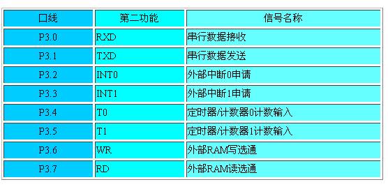 在应用中,如不设定P3端口各位的第二功能(WR,RD信叼的产生不用设置),则P3端口线自动处于第一功能状态,也就是静态I/O端口的工作状态。在更多的场合是根据应用的需要,把几条端口线设置为第二功能,而另外几条端口线处于第一功能运行状态。在这种情况下,不宜对P3端口作字节操作,需采用位操作的形式。