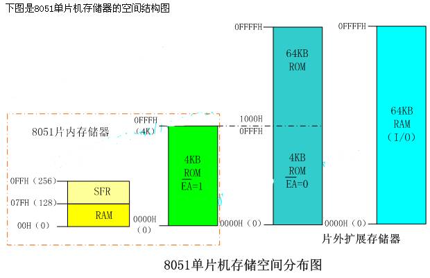 MCS-51具有64kB程序存储器寻址空间,它是用于存放用户程序、数据和表格等信息。对于内部无ROM的8031单片机,它的程序存储器必须外接,空间地址为64kB,此时单片机的 端必须接地。强制CPU从外部程序存储器读取程序。对于内部有ROM的8051等单片机,正常运行时, 则需接高电平,使CPU先从内部的程序存储中读取程序,当PC值超过内部ROM的容量时,才会转向外部的程序存储器读取程序。