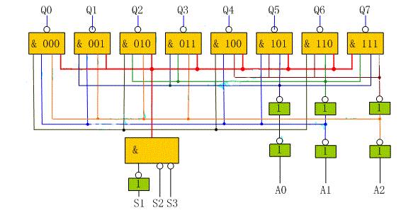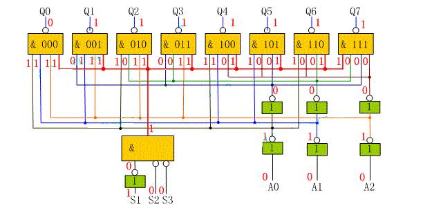 例如:控制信号为1,地址信号为“0”时,与门输出低电平,V1管截止;反相器输出高电平,V2管导通,输出引脚的地址信号为低电平。请看下图(兰色字体为电平):