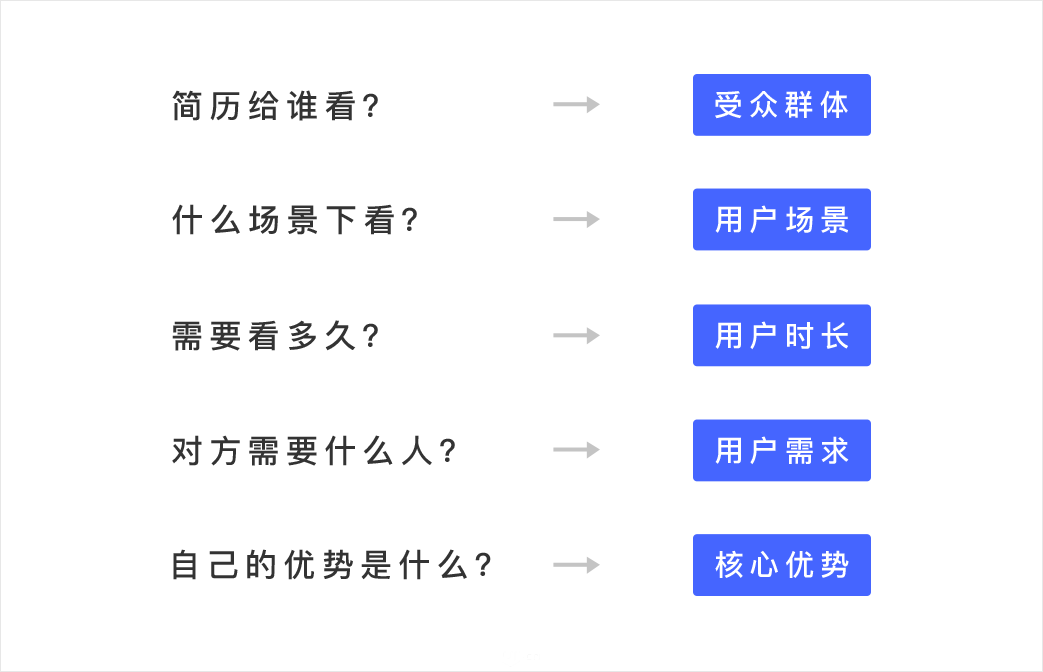 那么,你有没有在做简历时考虑到以下因素:简历给谁看 ( 受众群体 )、在什么场合下看(用户场景)、预计要看多久( 使用时长 )、对方需要什么样的人(用户需求)、自己的优势是什么(核心价值)…
