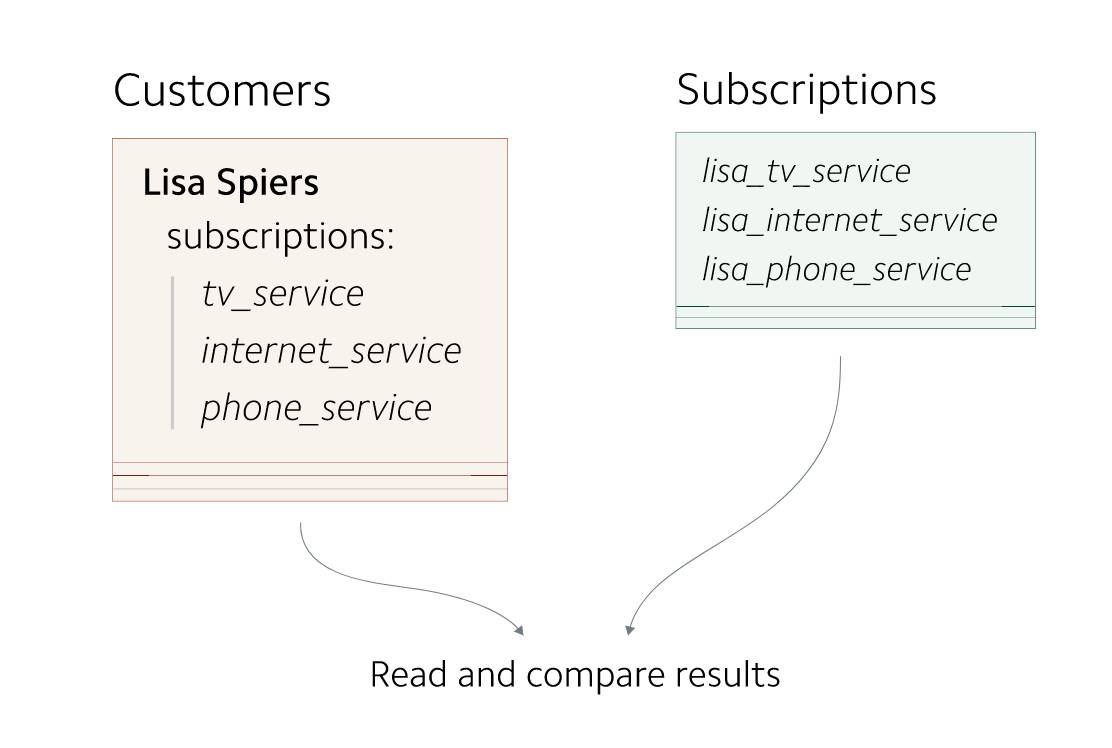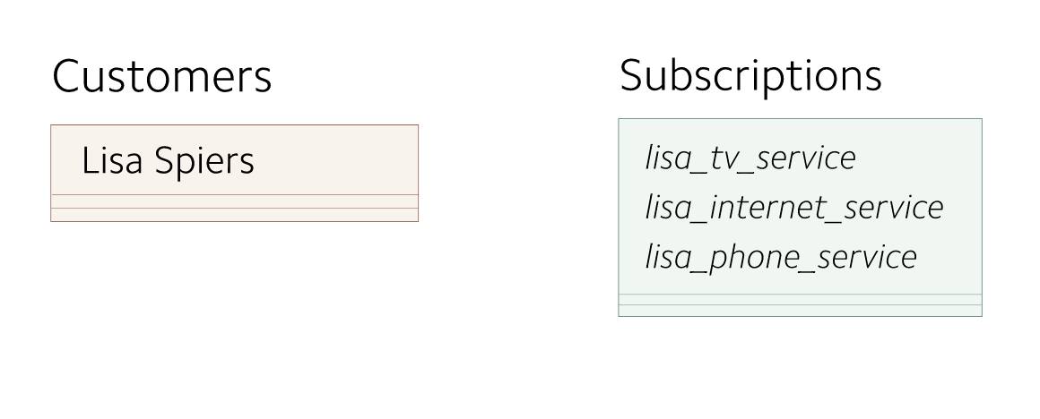 在早期,每个 Customer 对象最多只有一个 subscription 。 customers 信息存储为单独的记录。因为 customers 到 subscriptions 之间的映射关系非常简单,所以subscriptions 信息与 customers 信息存储在一起。