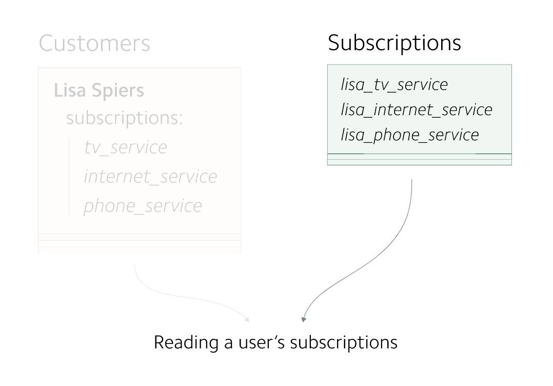 当添加新功能时,这个数据模型便出现问题了。任何对 subscriptions 的修改都会引发整条 Customer 记录的更新,以及 subscriptions 相关的查询都要通过扫描 customer 对象实现。所以我们决定将 subscriptions 独立存储。