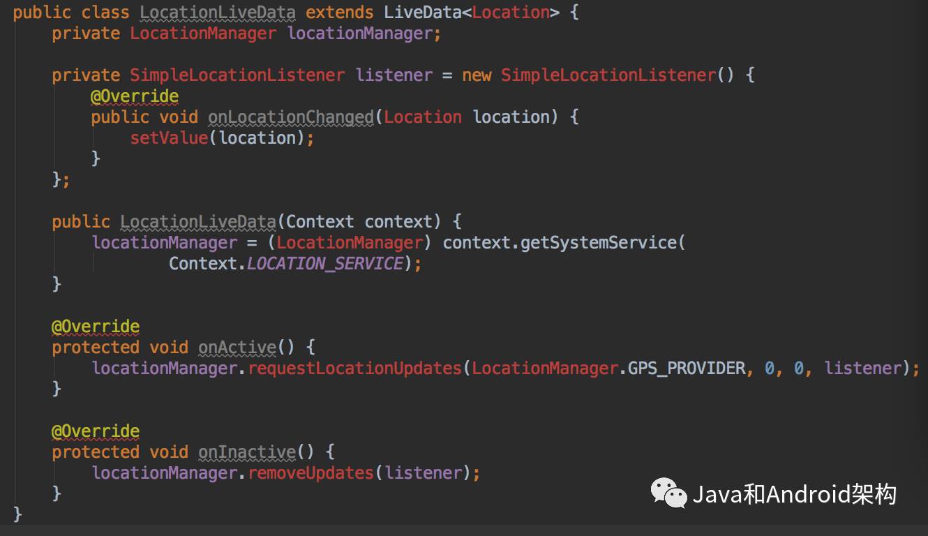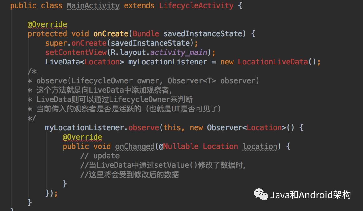 onActive() // 当前LiveData有超过一个的活跃的观察者时,被调用 onInactive() // 当前没有任何活跃的观察时,着被调用 setValue() // 勇于改变当前数据,这样观察者可以受到改变后的数据。 // 观察数据变化,并感知当前UI的生命周期 observe(LifecycleOwner owner, Observer<T> observer)