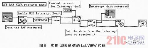 在LabVIEW开发环境中,使用“VISA打开”模块打开USB设备,在“VISA启用事件”模块中使能USB中断,在“VISA等待事件”模块中设置超时时间。设置完成后,可在“VISA获取USB中断数据”模块中得到USB数据。实现USB通信的LabVIEW代码如图5所示。
