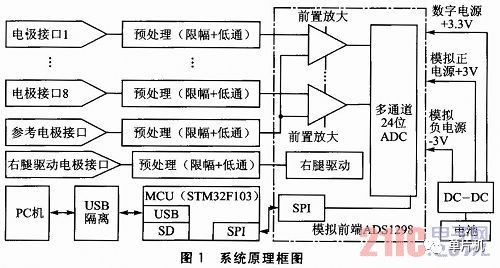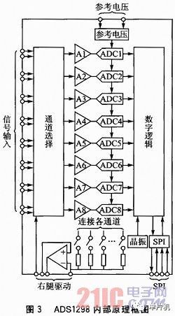 本系统的模拟前端采用TI公司的ADS1298芯片。其内部原理框图如图3所示。