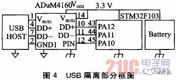 为保护人体安全,本设计中采用ADuM4160芯片进行上下位机隔离,下位机采用电池供电。ADuM4160芯片是ADI公司推出的专用USB隔离芯片,具有透明、易于配置、兼容USB2.0协议、可隔离5 000 V电压等优点。图4为USB隔离部分框图。芯片左侧VBUS1、DD+、DD-和GND1分别连接上位机的5 V、USB正端、USB负端和地线;芯片右侧VBUS2、DD+、DD-和PIN分别连接MCU的电源、USB正端(PA12口)、USB负端(PA11口)、I /O口(PA10口),其中PIN为使能端。