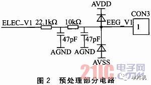 图2为预处理部分电路。该部分由二阶无源低通滤波和限幅电路组成,起到消除高频干扰和过压保护的作用。其中,低通截止频率为30 kHz,可通过电压幅值范围为±700mV。