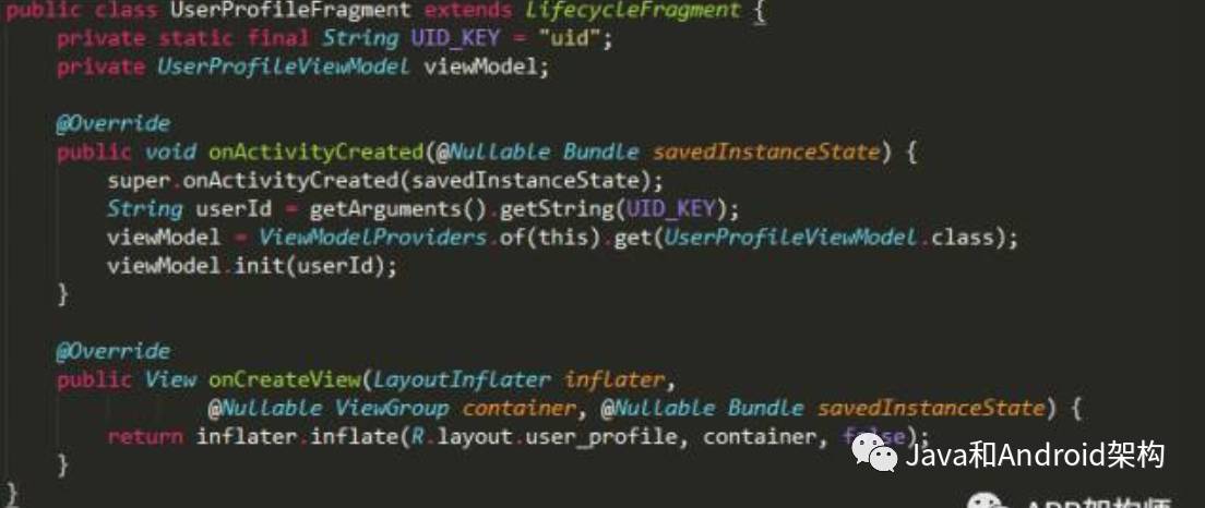注意:上面的UserProfileFragment继承自LifeCycleFragment而不是Fragment。当Lifecycle的Api稳定后,Fragment会默认实现LifeCycleOwner。