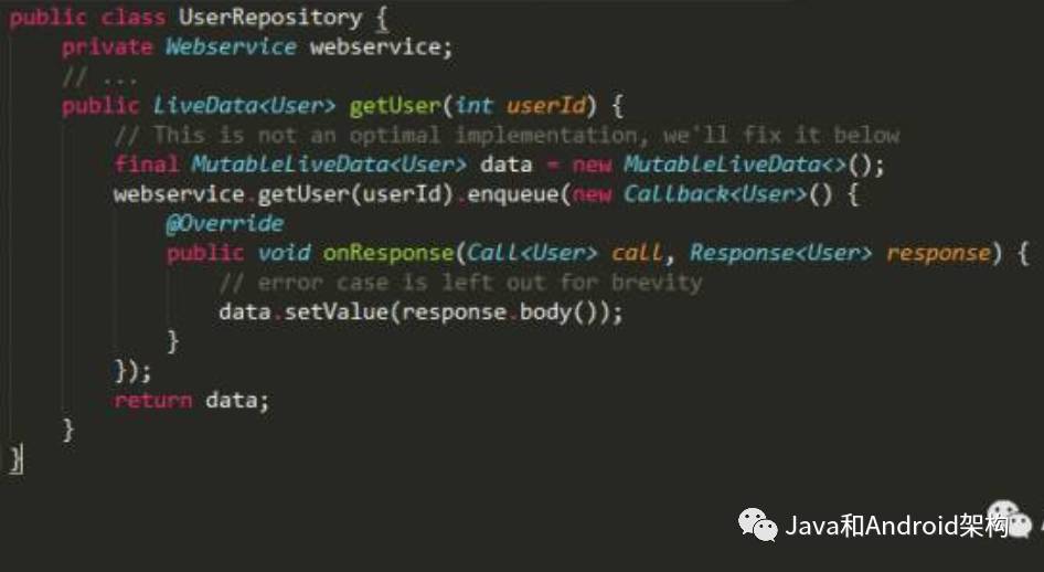 上面的UserRepository实现的问题是,在获取数据之后,它不会保留在任何地方。如果用户离开UserProfileFragment并重新进来,则应用程序将重新获取数据。这是不好的,有两个原因:它浪费了宝贵的网络带宽和迫使用户等待新的查询完成。为了解决这个问题,我们将向我们的UserRepository添加一个新的数据源,它将把User对象缓存在内存中。如下: