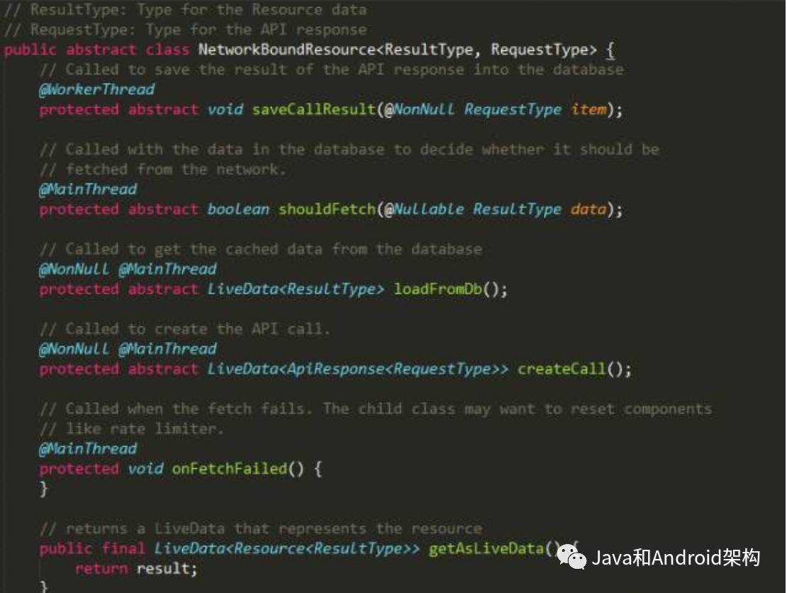注意到上面定义了两种泛型,ResultType和RequestType,因为从网络请求返回的数据类型可能会和数据库返回的不一致。