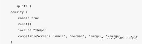 3、选择支持合适的图片,目前有ldpi mdpi hdpi xhdpi xxhdpi xxxhdpi资源文件夹,可根据自己app的用户设备选择支持2-3种即可(当然一套也行) 高版本的gradle已不再支持通过resConfigs “nodpi”, “hdpi”, “xhdpi”, “xxhdpi”配置支持的资源,只能人肉删除。如果你只想打包某一种屏幕密度的资源,可以使用分包策略,添加如下density配置可以只支持打包xhdpi资源(如果出现某些资源xhdpi没有,而其他文件夹包含的情况也不用担心,gradle会保留相应资源),这种配置最终会出多个apk包,具体介绍可参看官方说明。