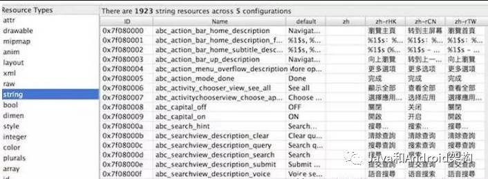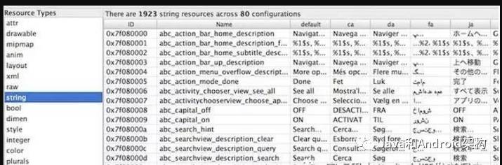 目前包括各种语言(v7包引入),点击resources.arsc可以看到支持80种