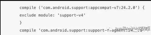 1、Google的support-v4包新版本已经做了拆分,24.2.0版本拆分成了5个module:support-compat、support-core-utils、support-core-ui、support-media-compat、support-fragment,可以根据自己需要单独引用相应的module。 v7包也会依赖v4,maven依赖有个好处,可以通过exclude单独剔除相应依赖,如下: