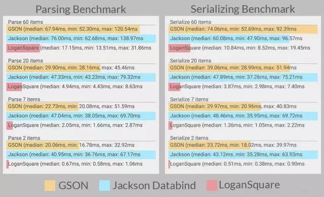 LoganSquare是近两年崛起的快速解析和序列化JSON的Android函数库,其底层基于jackson的streaming API,使用APT(Android Annotation Tool)实现编译时注解,从而提高JSON解析和序列化的性能。官网上可以看到LoganSquare和gson、jackson databind的性能对比。