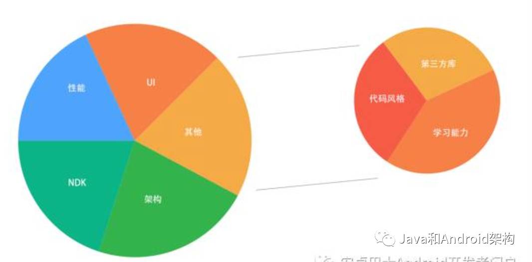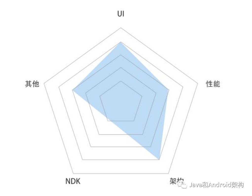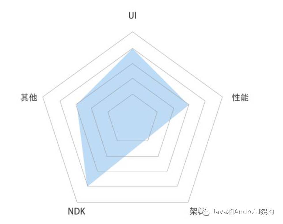重点看我们 PPT 中的图。在 Android 开发的过程中,需要很多很多的知识,而有些知识也很难为其分类,在这里,我把它们分为上述五个部分:UI、架构、性能、NDK、其他,其他则可以细化为代码风格,学习能力,第三方库等。