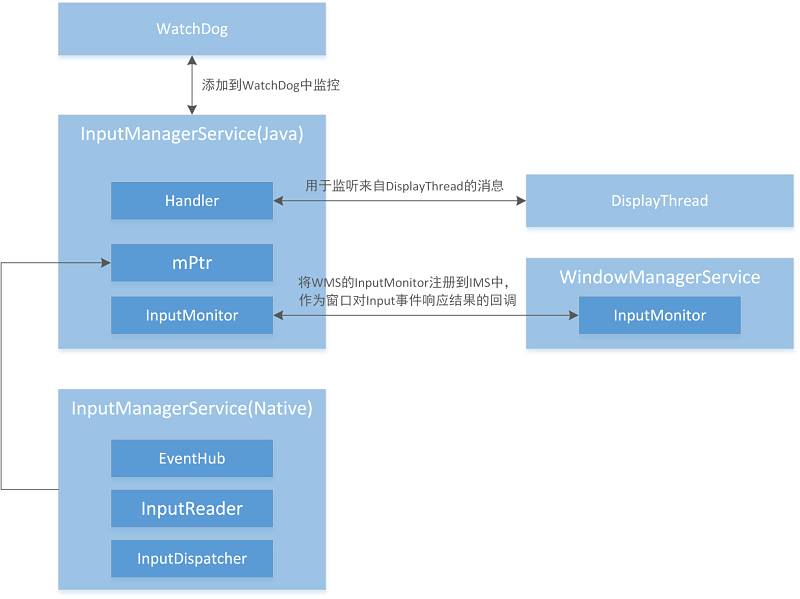 这里可能有人就会问了,为什么InputManagerService要和DisplayThread绑定在一起?大家不妨想想,InputEvent无论如何被获取、归类、分发,最终还是要被处理,也就意味着最终它的处理结果都要在UI上体现,那么InputManagerService自然要选择和UI亲近一些的线程在一起了。