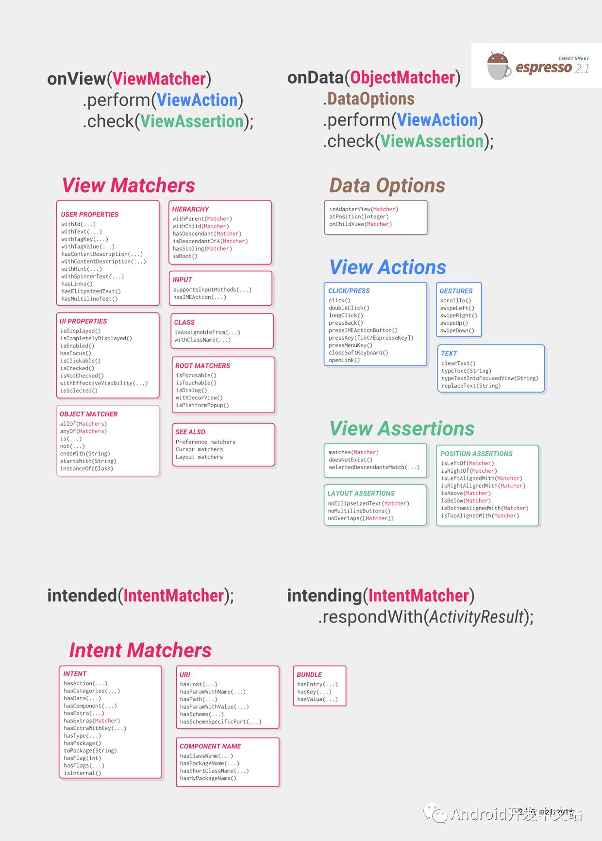 下面一张图总结了Espresso中常见的方法,包括Matcher、Action和Assertion。
