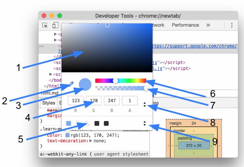 在Styles边栏 点击任意颜色的小色块,就可以弹出颜色选择器