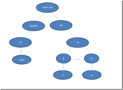 若从左向右的匹配,过程是:从.mod-nav开始,遍历子节点header和子节点div,然后各自向子节点遍历。在右侧div的分支中,最后遍历到叶子节点a,发现不符合规则,需要回溯到ul节点,再遍历下一个li-a,假如有1000个li,则这1000次的遍历与回溯会损失很多性能。