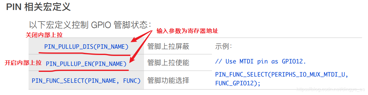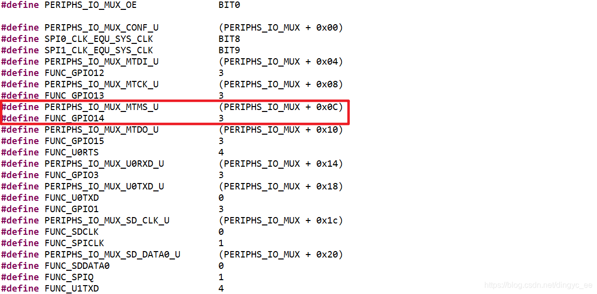 比如我选定GPIO14这个管脚,则这样写:PIN_FUNC_SELECT(PERIPHS_IO_MUX_MTMS_U, FUNC_GPIO14);