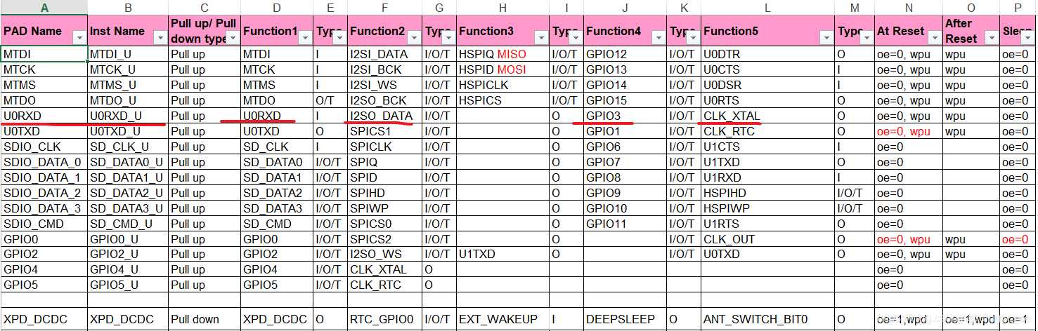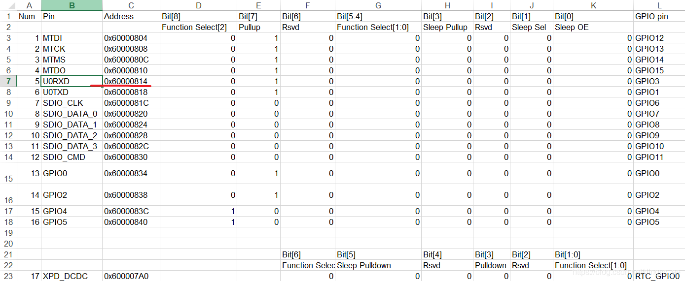 如上图所示,这个引脚的功能1是N0RXD(串口0数据接收引脚),功能2是I2SO_DATA(I2S数据引脚)、功能4是普通的GPIO3、功能5是CLK_XTAL(时钟晶振引脚),然后这个功能配置寄存器的地址如下所示:
