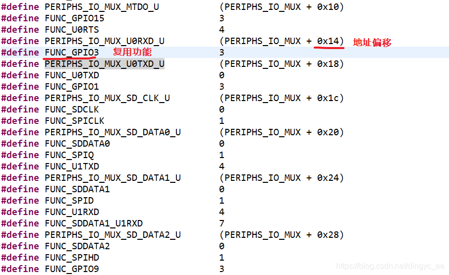 由上面的分析可知,如果我们希望使用功能4配置为GPIO3,则要往寄存器对应位写入3。在 eagle_soc.h 头文件中,有设置寄存器地址和功能的宏定义: