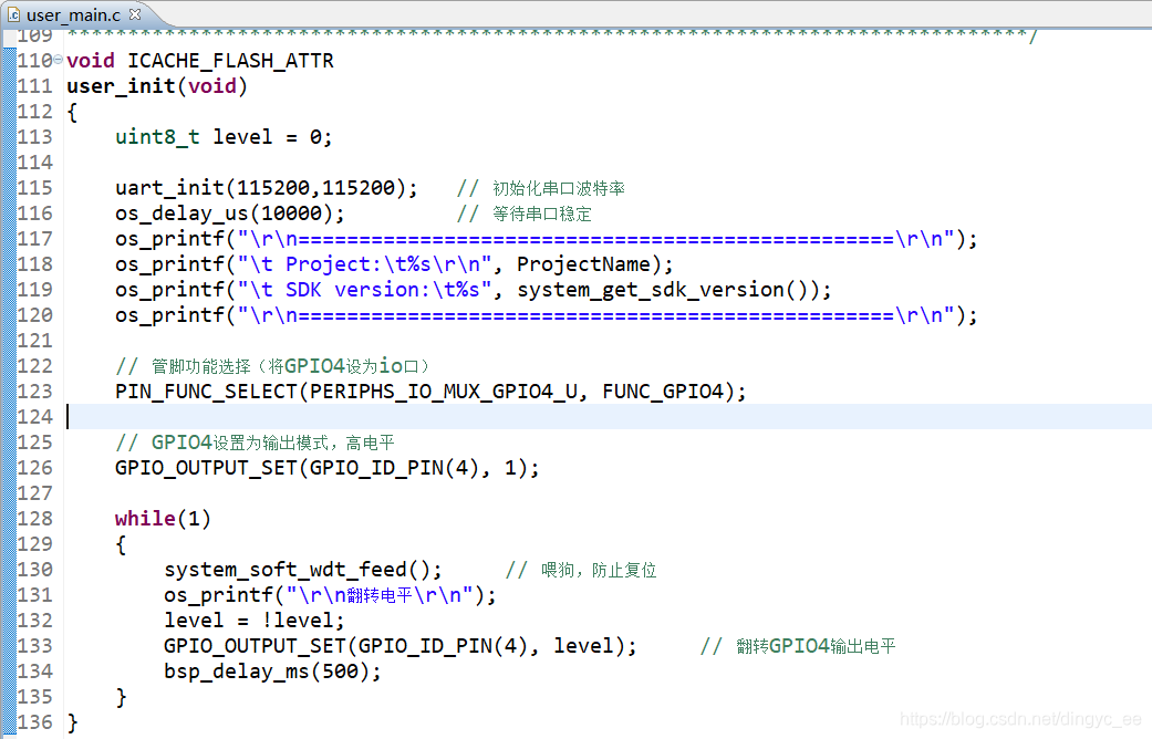 125. GPIO_OUTPUT_SET(GPIO_ID_PIN(4), 1); // GPIO4设置为输出模式,高电平