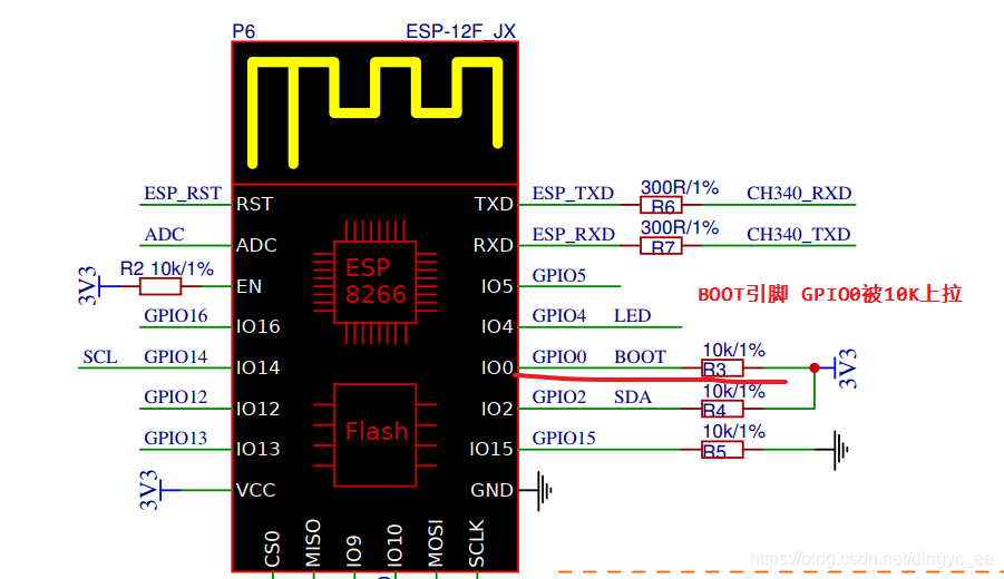 可以看到,BOOT引脚接到了GPIO0,默认被10K电阻上拉为高电平;当按键按下时,GPIO0变为低电平。