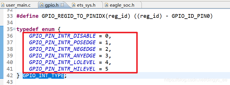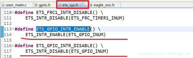 1 调用ETS_GPIO_INTR_DISABLE(函数位于ets_sys.h头文件),先关闭GPIO中断,以进行配置;