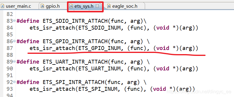 2 调用ETS_GPIO_INTR_ATTACH这个API,注册中断回调函数(中断函数要自己实现);