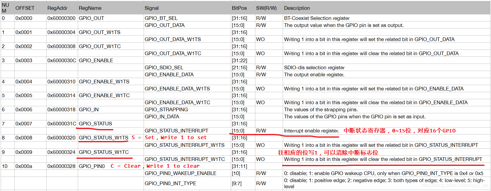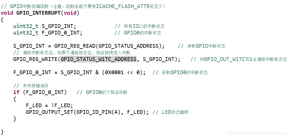 3. GPIO_REG_WRITE(GPIO_STATUS_W1TC_ADDRESS, S_GPIO_INT); // 向GPIO_OUT_W1TC写1会清除中断标志位