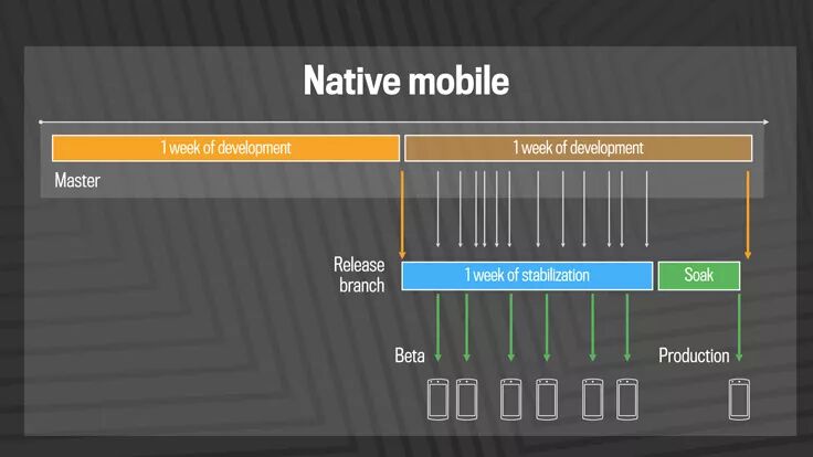 通过将传统的持续交付技术应用到移动栈,我们已经从四周发布一版发展到两周发布一版,再到现在的一周发布一版。目前我们在移动平台上使用的就是之前基于web的策略:branch/ cherry- pick模型。虽然我们每周只发布一个版本,但在现实环境中尽早测试代码仍然很重要,因为这样工程师就可以尽快得到反馈。我们每天都会为我们的金丝雀用户(包括大约100万个Android beta测试人员)提供新的移动候选版本。